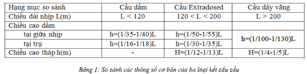 “Cầu Extradosed cho phép chiều dài nhịp không bằng nhau, bố trí nhịp không đối xứng, nhiều nhịp có cáp dự ứng lực ngoài và các nhịp biên có cùng tiết diện với các nhịp chính. Trong số các cầu được trích dẫn trong nghiên cứu này, 41 trong số 51 cầu có nhịp chính từ 75 đến 200 m; 11 cầu Extradosed hai nhịp (một tháp), 30 cầu ba nhịp (2 tháp) và 10 cầu có nhiều hơn ba nhịp..” El Araby El Shenawy, 2013, trong luận văn tiến sỹ của mình tại đại học Berlin [8] chỉ ra rằng, cầu Extradosed, theo nhiều nghiên cứu, có chiều dài vượt nhịp tối ưu từ 100-200m.