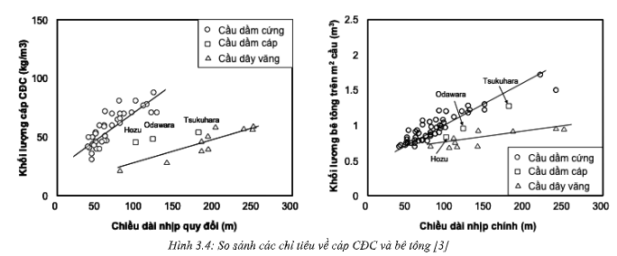 Nghiên cứu [2]; [3] đã tiến hành so sánh so sánh các chỉ tiêu về chi phí cáp CĐC và bê tông cho 1m2 cầu. Từ hình 3.4 cho thấy các chỉ tiêu chủ yếu về chi phí bê tông và chi phí cáp cường độ cao của cầu dầm cáp hỗn hợp đều nằm trong phạm vi giữa cầu dầm cứng và cầu dây văng. Đối với cầu có khẩu độ lớn hơn 100m, chi phí vật liệu của cầu dầm cáp hỗn hợp nhìn chung là nhỏ hơn cầu dầm cứng và lớn hơn cầu dây văng có cùng kích thước [3]. Có thể nhìn thấy ở đây, với chiều dài nhịp 100-200m, khối lượng cáp CĐC nằm trong khoảng giữa cầu dầm cứng và cầu dây văng, trong khi đó khối lượng bê tông trên 1m2 cầu trong cầu Extradosed tương đương với cầu dây văng (và thấp hơn