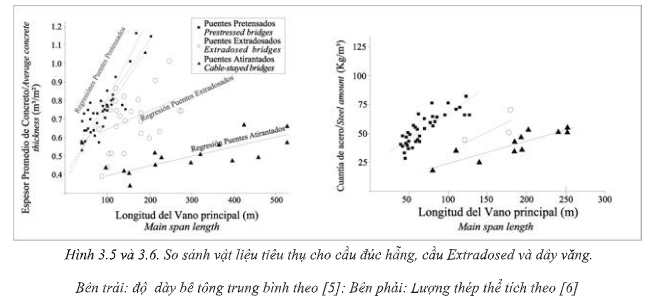 Theo quan điểm hình thái học, cầu Extradosed được biết đến như cầu trung gian giữa cầu dây văng và cầu dầm hộp dự ứng lực (hình 3.5). Nhận xét này xuất phát từ khối lương vật liệu liên quan sử dụng được thể hiện trong hình 3.6, trong đó Mermigas (2008) [5] so sánh chiều dày trung bình tính đổi của bê tông (khối lượng bê tông của dầm sàn / công xôn) và mặt khác Kasuga (2002) [6] so sánh số lượng bó cáp cần thiết cho cầu Extradosed và cầu dầm hộp dự ứng lực thi công đúc hẫng; Cả hai biểu đồ chỉ ra rằng tiêu thụ nguyên vật liệu chính trong các cầu Extradosed rơi vào vùng trung gian giữa hai loại còn lại.