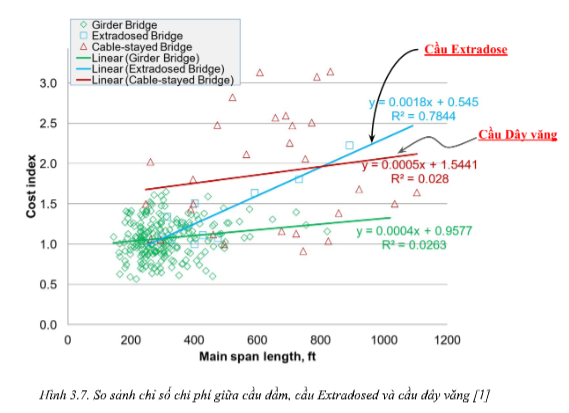 Các nghiên cứu của Jiong Hu, Yoo Jae Kim, and Soon-Jae Lee [1] đã đưa ra các phân tích về chi phí của các dạng cầu và đã thể hiện bằng đồ thị mối quan hệ giữa chiều dài nhịp chính và chi phí đối với các dạng cầu dầm, cầu Extradosed và cầu dây văng (Hình 3.7). Qua các đồ thị thống kê này có thể kết luận, khi chiều dài nhịp chính lên đến 768ft, tức là đến 234m trở lên thì chi phí đối với cầu Extradosed bắt đầu cao hơn cầu dây văng.