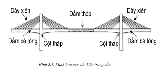 Theo Bùi Khắc Điệp [2], thực chất cầu Extradosed là cầu dầm – cáp hỗn hợp. Để khẳng định điều này, trước hết phải định nghĩa các kết cấu chủ yếu trong cầu. Cầu dầm cáp hỗn hợp là dạng kết cấu tổ hợp giữa kết cấu của cầu dầm cứng và cầu dây văng, trong đó hệ dầm cứng làm việc chịu uốn nén và dây treo chịu kéo. Các dây treo được liên kết vào tháp neo dây và một số điểm trên dầm cứng tạo thành các gối đàn hồi. Cầu dầm cáp hỗn hợp nhìn về hình dáng trông rất giống cầu dây văng, nhưng sự làm việc của kết cấu gần với cầu dầm cứng hơn là cầu dây văng và được cấu tạo gồm ba phần chính: i) Hệ dầm cứng; ii) Hệ dây treo; và iii) Tháp neo dây [9]. (Hình3.1).