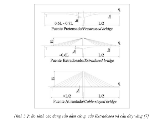 “Đây là thể loại cầu kết hợp giữa hai loại kết cấu của cầu dầm cứng và cầu dây văng, rất đa dạng về mặt kết cấu dựa trên cơ sở kết hợp được các ưu điểm của cả hai loại cầu dầm cứng và cầu dây văng. Cầu dầm cáp hỗn hợp có khẩu độ vừa và lớn từ 90~200m”. Theo [9], [10] thì cầu Extradosed là “Giải pháp hợp lý cho nhịp trung bình”
