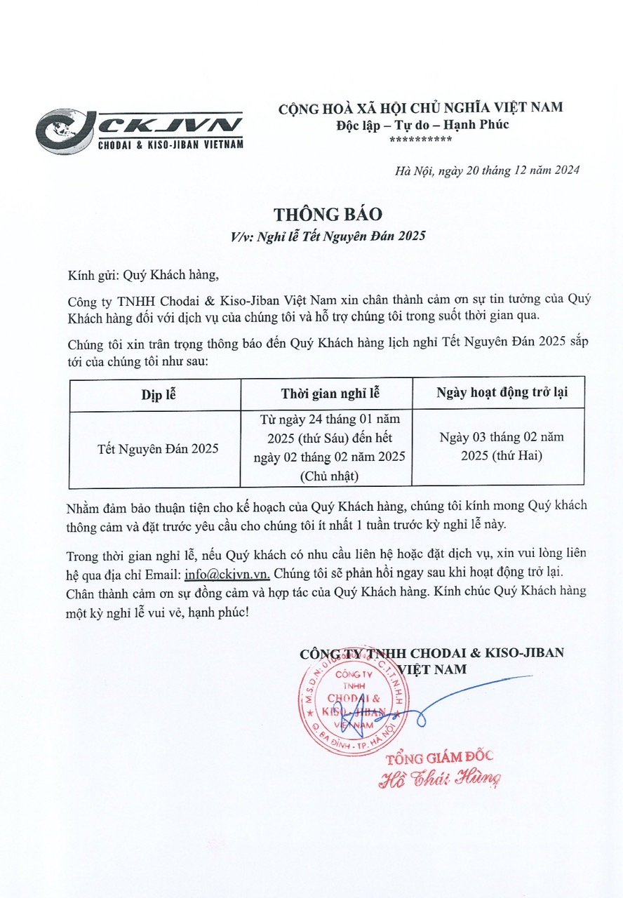 Công ty TNHH Chodai & Kiso-Jiban Việt Nam xin chân thành cảm ơn sự tin tưởng của Quý Khách hàng đối với dịch vụ của chúng tôi và hỗ trợ chúng tôi trong suốt thời gian qua. Chúng tôi xin trân trọng thông báo đến Quý Khách hàng lịch nghỉ Tết Nguyên Đán 2025 sắp tới của chúng tôi như sau: