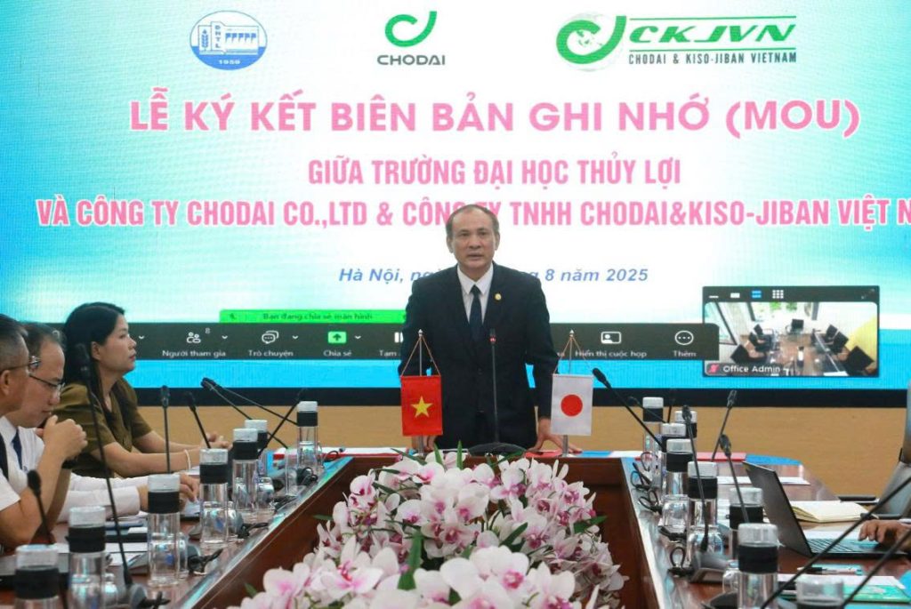 At the ceremony, Prof. Dr. Nguyen Trung Viet, Rector of Thuyloi University; Mr. Sekiya Takao, Chief Engineer in charge of the Vietnam region and representative of Chodai Co., Ltd. (Japan); and Mr. Ho Thai Hung, General Director of Chodai & Kiso-Jiban Vietnam Co., Ltd., signed and exchanged the Memorandum of Understanding (MOU).