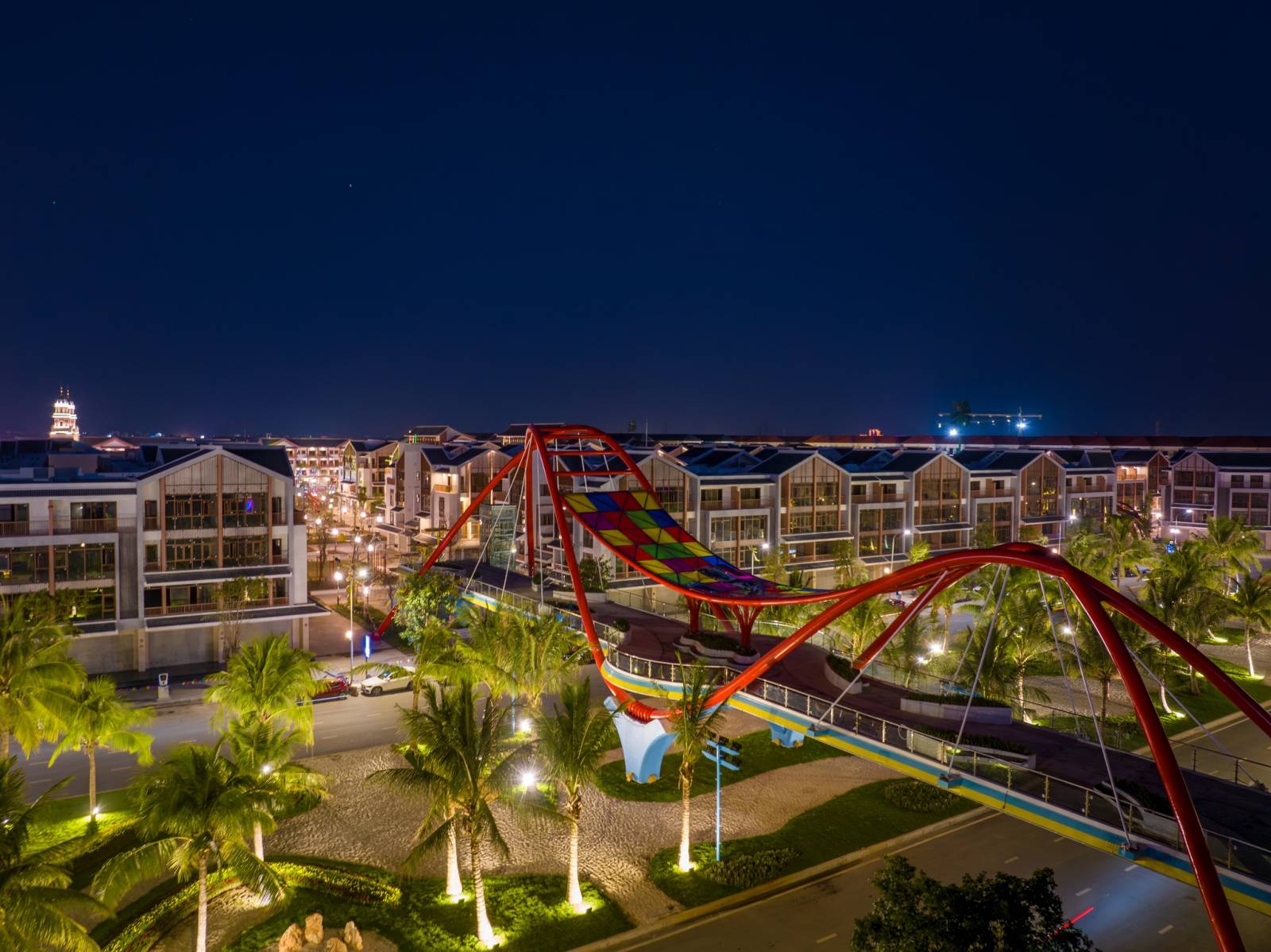 At night, the Wave Bridge is illuminated by colorful lights, creating a dazzling, enchanting beauty and an ideal experience for you and your family as you stroll here.