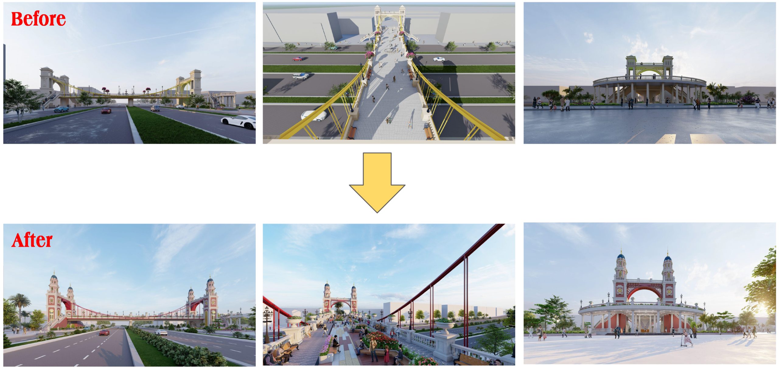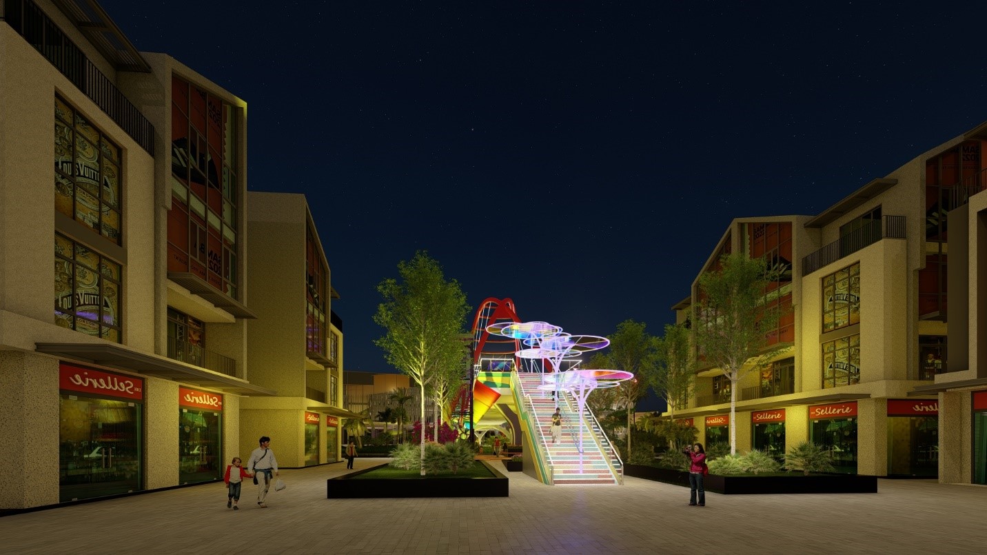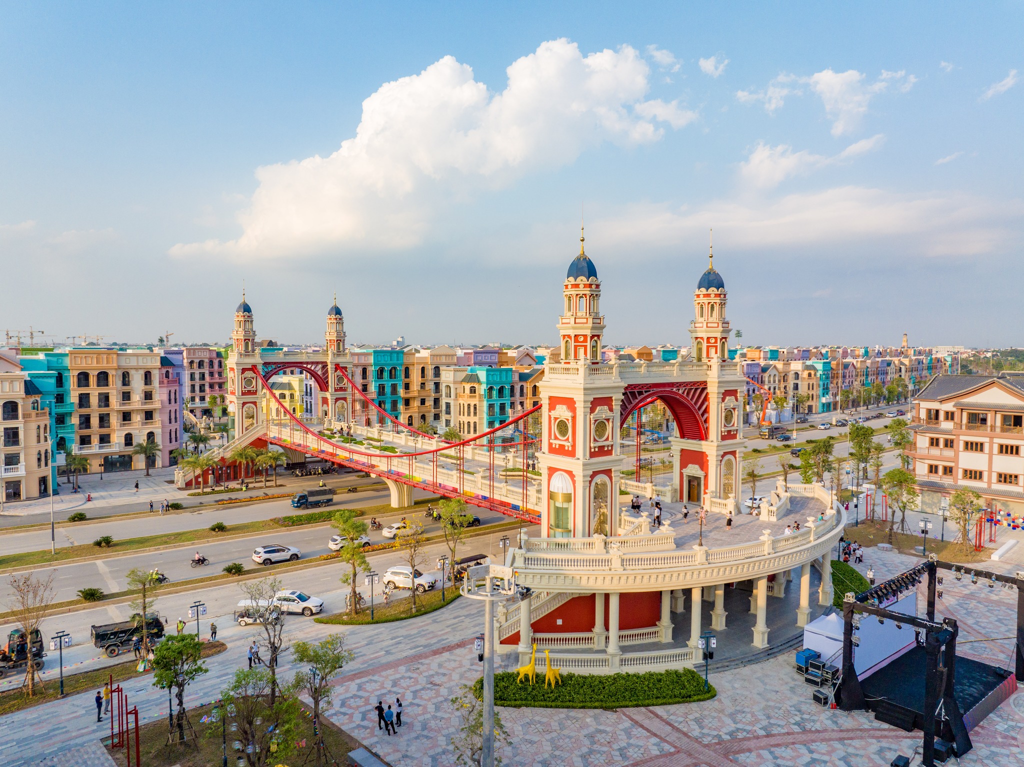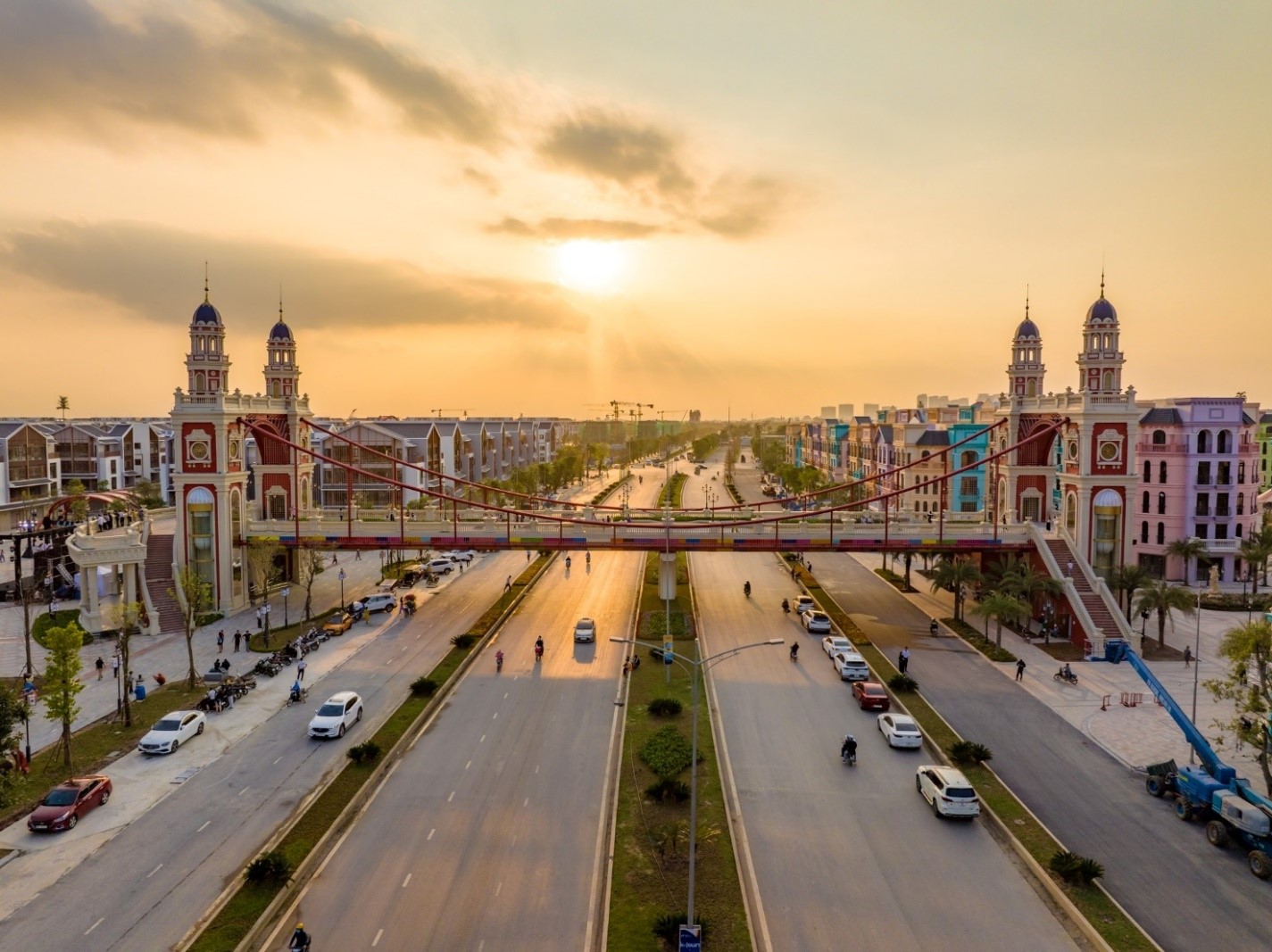 The East-West Bridge draws inspiration from classical architecture, with a harmonious design, serving as a symbolic ‘bridge’ between The Venice district (representing the prosperous West) and K-Town (symbolizing the rich cultural heritage of the East). The bridge spans 12.6 meters wide (including flower beds on both sides) across the Ring Road 3.5, serving as a distinctive highlight of Mega Grand World Hanoi Entertainment Universe. Upon arrival, visitors can experience the fusion of cultures from East Asia and Southern Europe (Korea – Italy) within just a few steps. Additionally, the bridge is equipped with elevators for the convenience of movement for residents and tourists between the romantic Venice district and the vibrant K-Town. The bridge features pedestrian walkways and seating areas for relaxation and scenic views, adorned with colorful flower gardens.