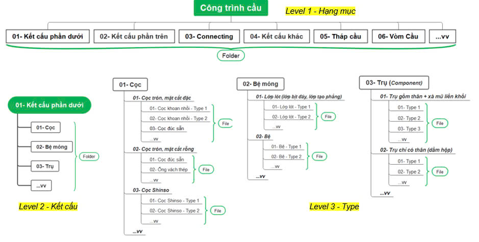 Với các dự án công trình Cầu mà bộ phận IBIM hay thực hiện, cấu trúc thư mục lưu trữ được xác định, lựa chọn theo sơ đồ như sau:
