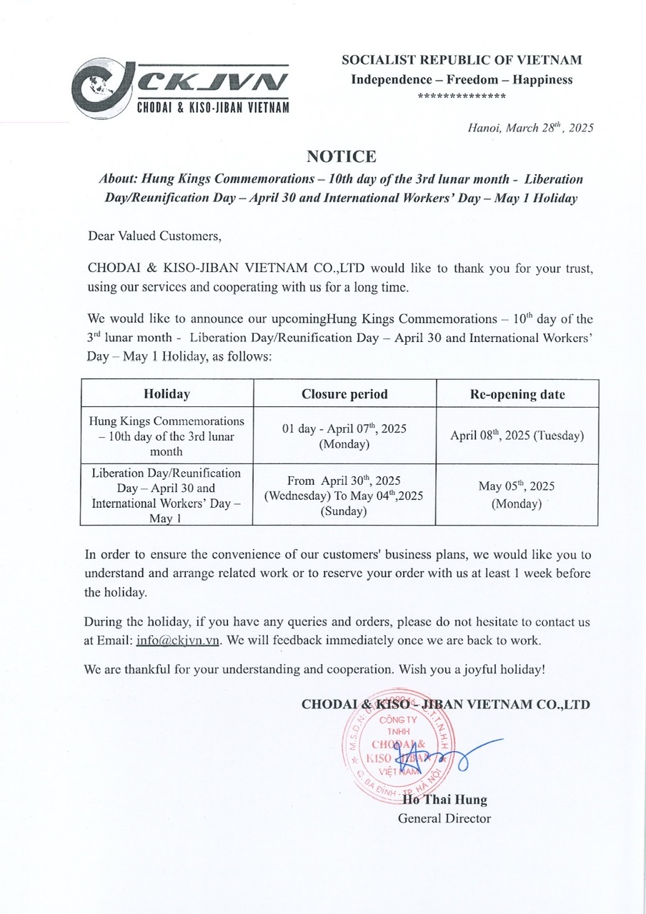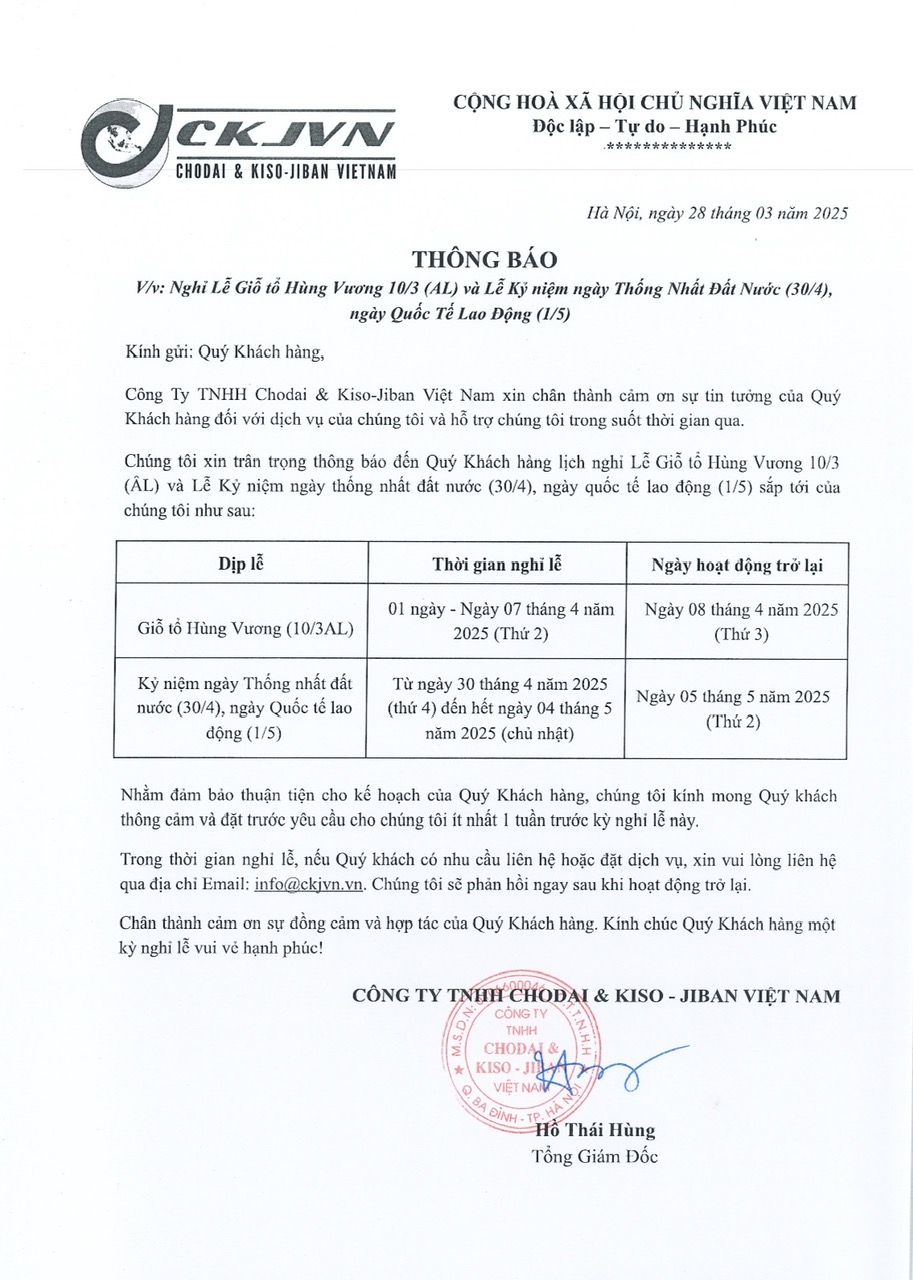 THÔNG BÁO V/v: Nghỉ Lễ Giỗ tổ Hùng Vương 10/3 (AL) và Lễ kỷ niệm 50 năm “Ngày giải phóng miền Nam, thống nhất đất nước” (30/4/1975-30/4/2025), ngày quốc tế lao động (1/5)